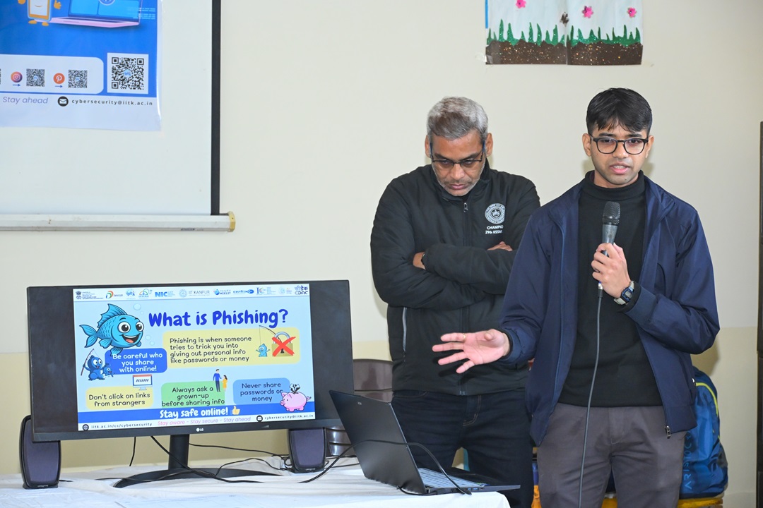 A workshop on cybersecurity, safe internet practices and responsible use of AI was conducted by the Computer Centre, IITK, at Opportunity School, IIT Kanpur, on the occasion of Safer Internet Day. The session, led by the experts Mr Navneet Sharma and Mr Sagar Rana, a member of the cybersecurity team, Computer Centre, IIT Kanpur, witnessed active participation from around 110 students and teachers.