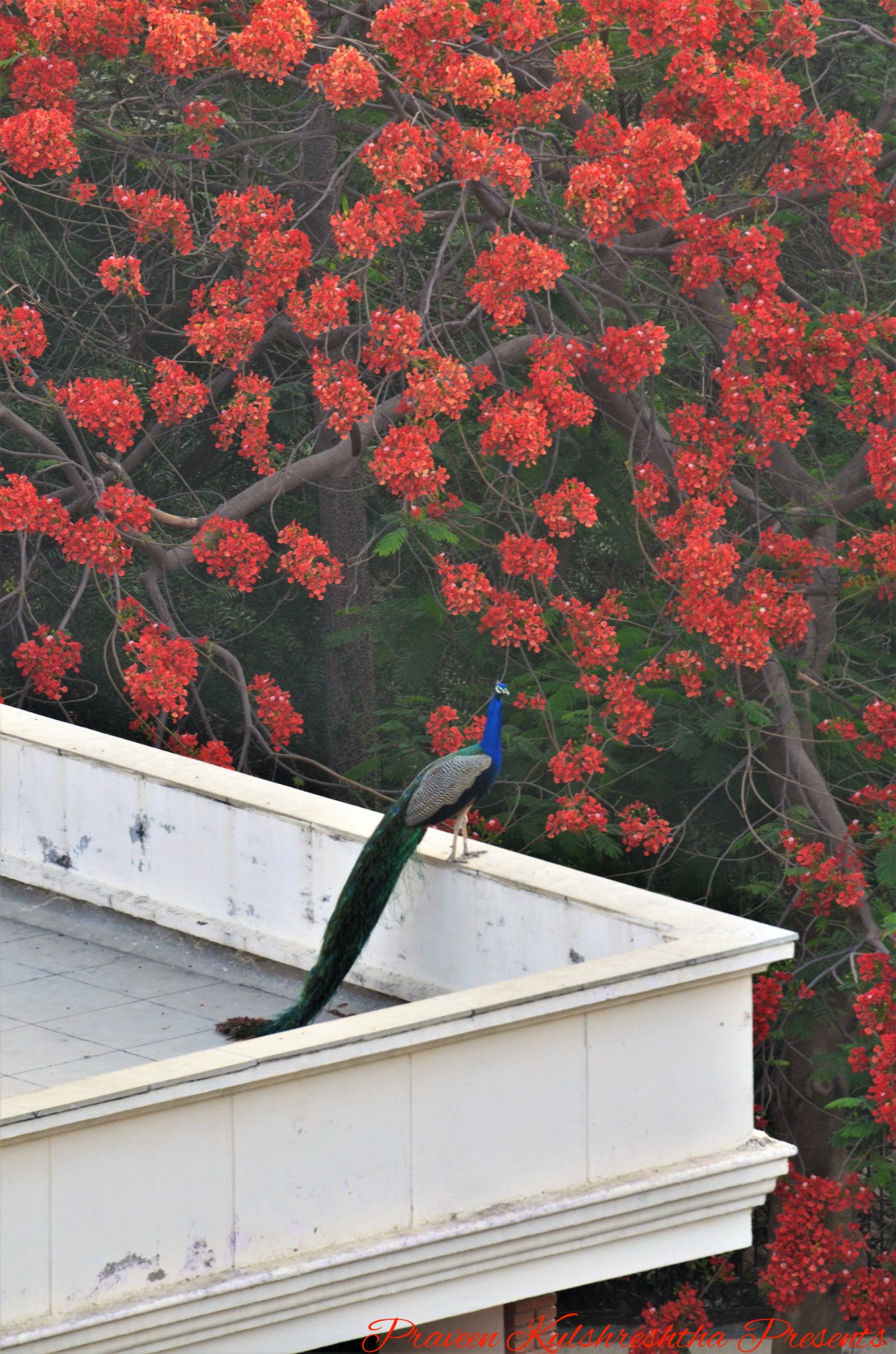Colours of Summer. A peacock perches on the roof top of the New RA Hostel. IITK, with a Gulmohar Tree in the background. Picture: Prof Praveen Kulshreshtha (Dept of Economics), 2018.