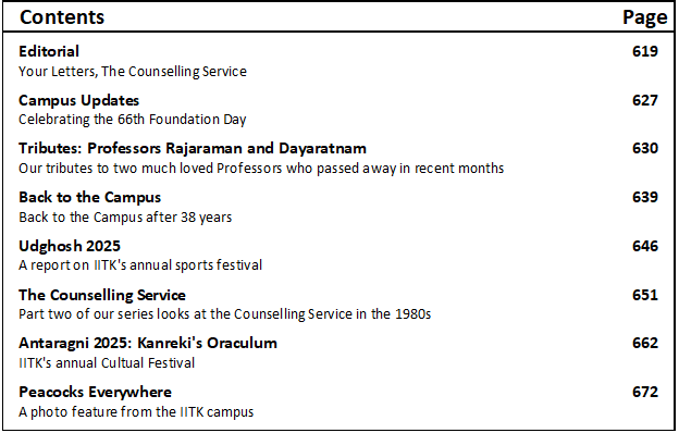 Now coming to the latest issue, while there are many memorable items, I would pick on Student Counselling. It was a totally new idea, at least as far as Indian academia is concerned. It has been tuned and perfected to meet our student needs. There were faculty in Psychology and other departments who took deep interest to address the specific problems and needs of the IITK students. Many others, such as faculty wives, participated and took deep interest. Sometimes these counsellors came up with very original ideas. For e.g., when the student appeared to be not forthcoming and uneasy to communicate in the Counselling Office, they invited the student to their homes where they felt at home and opened up with the issues faced by them. That is just one example for a multi-pronged effort.