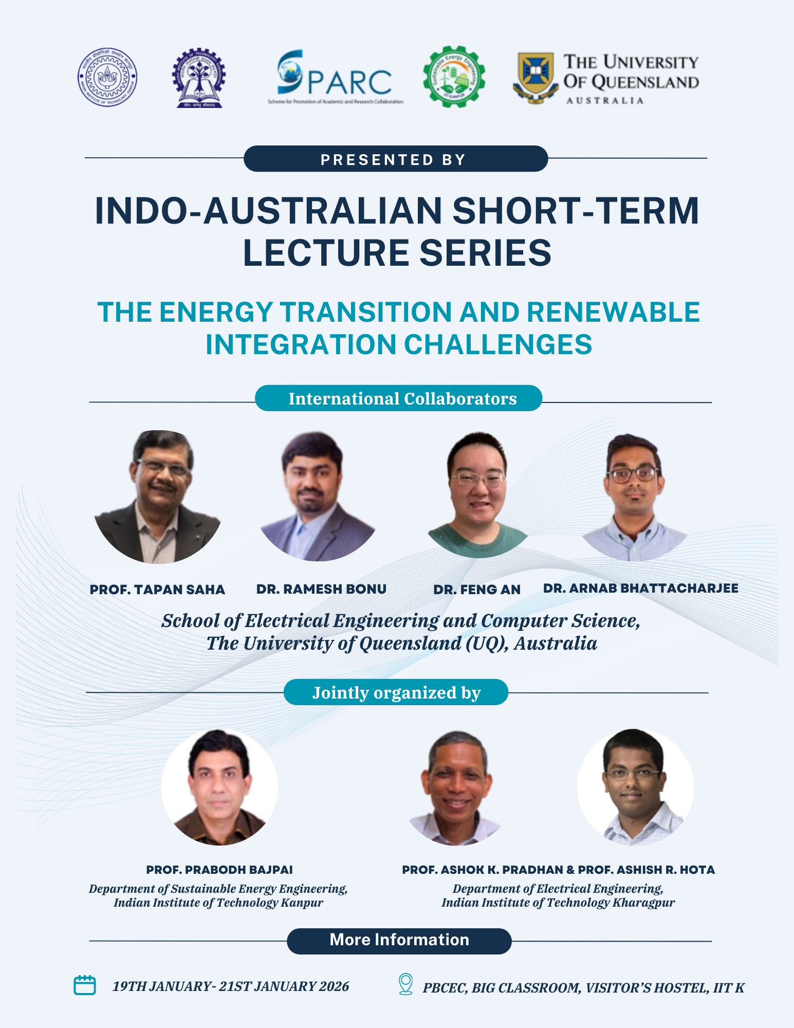 šŸ“ƒ Advancing the energy transition through global collaboration⚔The Indo–Australian Short-term Lecture Series on the Theme of ā€œThe Energy Transition and Renewable Integration Challengesā€ under Scheme for Promotion of Academicand Research Collaboration (SPARC) at IIT Kanpur brings together experts from the University of Queensland, IIT Kanpur, and IIT Kharagpur to address real-world challenges in renewable integration, grid stability, microgrids, and power systems (19–21 Jan 2026). Poster