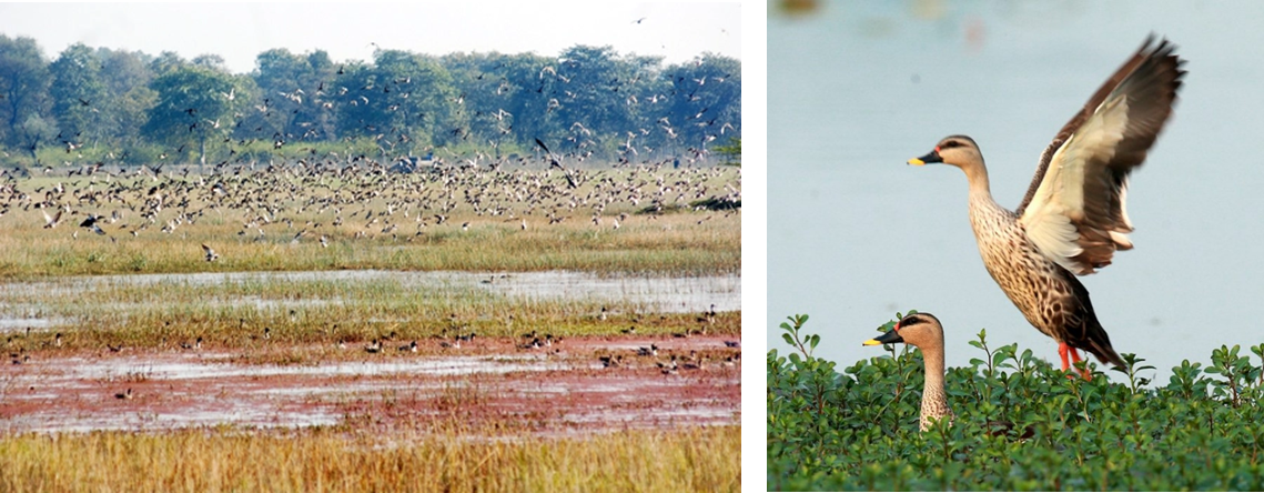 The Nawabganj Bird Sanctuary, nestles in tranquil lush green stretch on 224.6 Hectare area of Unnao District in Uttar Pradesh. It is one of the many wetlands of Northern India. The sanctuary provides protection for 250 species of migratory birds mostly from CIS(or formerly USSR) countries. The sanctuary becomes a lively haven in winters to many international and national migratory birds like Garganey Teal, Mallard, Purple Moorhen, Little Grebe, Spoonbill Duck, Red Wattled Lapwing, Wigon and many many more winged guests. A small park for deer is also present in the vicinity of the sanctuary where spotted and barking deer can be seen.