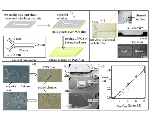 Abstract: Poly(dimethylsiloxane) (PDMS) has been used extensively for making microfluidic devices because of several favorable features: optical transparency, bio-compatiblity, easy moldability and its inertness towards most materials. However, PDMS is non-biodegradable and swells in contact with most solvents. It is also an expensive chemical. As an alternative to PDMS, here we have presented application of poly(glycerol sebacate) (PGS), a thermoset elastomer for fabrication of micro-channels. PGS is made using condensation reaction of a non-edible vegetable oil and glycerol which allows the Young's modulus of PGS elastomer to be varied over wide range: 0.125 -1.4 MP. PGS is also flexible, biocompatible and optically transparent. We have employed controlled etching with an aqueous solution of NaOH to make micro-channels of a variety of shapes, sizes and complexities on PGS. We have made straight and spiral channels and ones with patterned surface of the channel wall and depth. The PGS surface shows hydrophobicity initially but turns hydrophilic over time, with minimal swelling effect, thereby highlighting its suitability for both aqueous and non-aqueous media. Its compatibility with physiological conditions too is demonstrated by flowing buffer solutions of acidic and neutral pH and then carrying out UV-Vis analysis of the discharge liquid to show negligible leaching from the channel wall.
