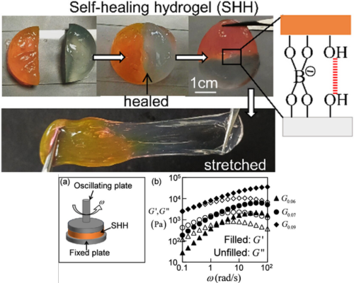 Abstract: Bonding hydrogels with silicone elastomers may allow fusion of the conductivity and biodegradability of hydrogels with the mechanical integrity and flexibility of silicone, which is desirable for many applications in flexible electronics, ionotronics, and microfluidics. However, hydrogels do not bond with silicone unless both materials are suitably functionalized. We show here that a two-phase composite (TPC) glue prepared by blending a self-healing hydrogel (SHH) made of starch, PVA, and borax with silicone forms a bridge between the two materials, eliminating the need for surface and bulk modification processes. The glue was made by dispersing drops of the SHH in silicone, followed by forming a thin layer of this dispersion on a typical silicone surface. Curing the dispersion bonds it with the latter. To bond a hydrogel to this glue, its top surface was removed mechanically or chemically to expose the gel phase to the surface, on which the SHH prepolymer mix was cross-linked. The SHH microparticles in the glue acted as anchors for the SHH layer to bond to it; the silicone phase of it at the other side bonded to the elastomeric layer, thereby creating a strong attachment between the two. The bonding strength of the SHH–TPC interface was estimated via pull-off experiments, which revealed that the debonding force scales as n1/3(xpxM2/3)g2/3, where n is the number of SHH particles in the TPC, g is the SHH weight fraction in the TPC, and xp and xM are the solid contents in the SHH in TPC and the SHH layer, respectively. The SHH–glue interface also exhibits reversible bonding/debonding for multiple cycles.