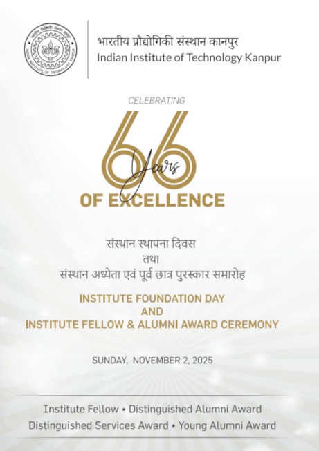 Every year on November 2, the Indian Institute of Technology Kanpur celebrates its Foundation Day, marking the Institute’s remarkable journey of excellence and impact. On this special occasion, an eminent Chief Guest is invited and the Institute honours its alumni and faculty by conferring its most prestigious recognitions across various categories, including Institute Fellows, the Distinguished Alumni Award, the Satyendra K. Dubey Memorial Award, the Distinguished Service Award, and the Young Alumni Award. These awards celebrate alumni who have made outstanding contributions in their respective fields and have brought pride to their alma mater.