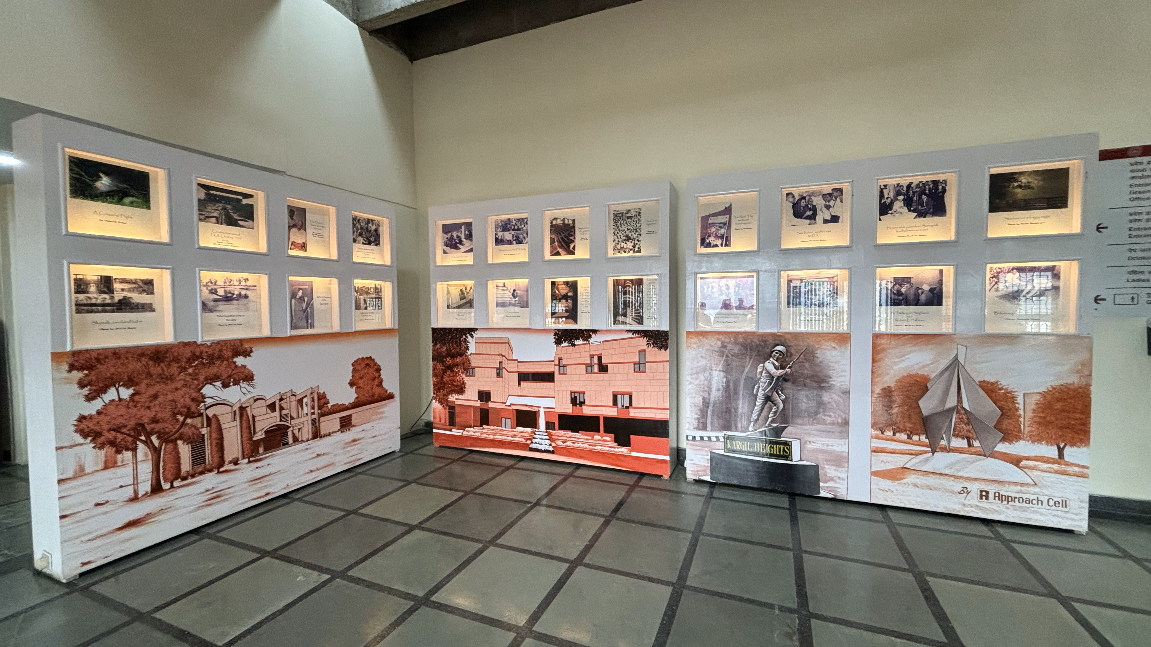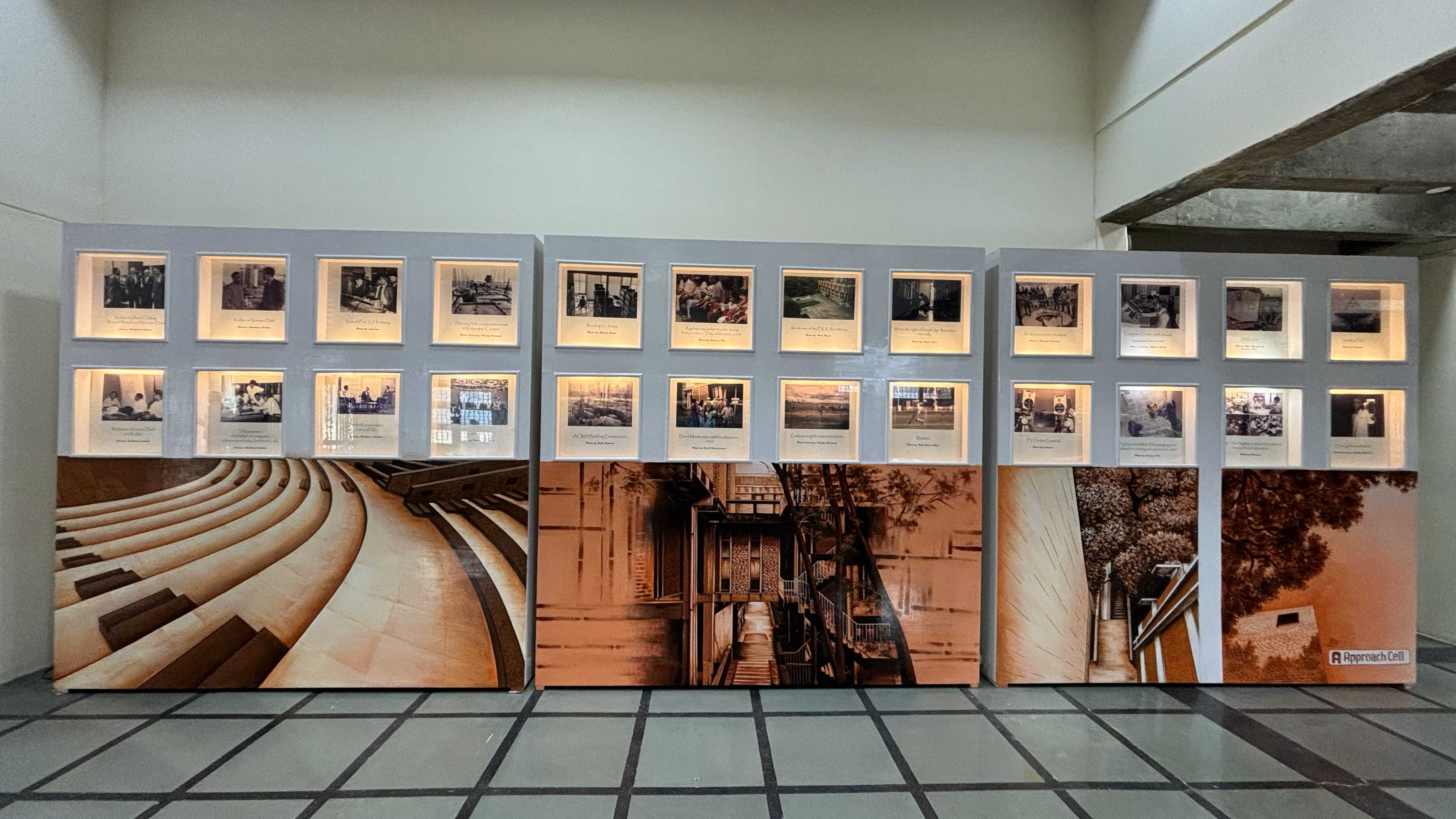 "In this renovation, we created contemporary oil paintings of the campus, below the historical photo backdrops. The paintings were recreated from campus photos, institute calendars, and private sketches. The artists who created these paintings belong to traditional ’painter’ families of old Kanpur city who used to create Bollywood Movie posters in the past! We invited them to our campus to create these marvellous campus paintings!” (Late Professor Sameer Khandekar)