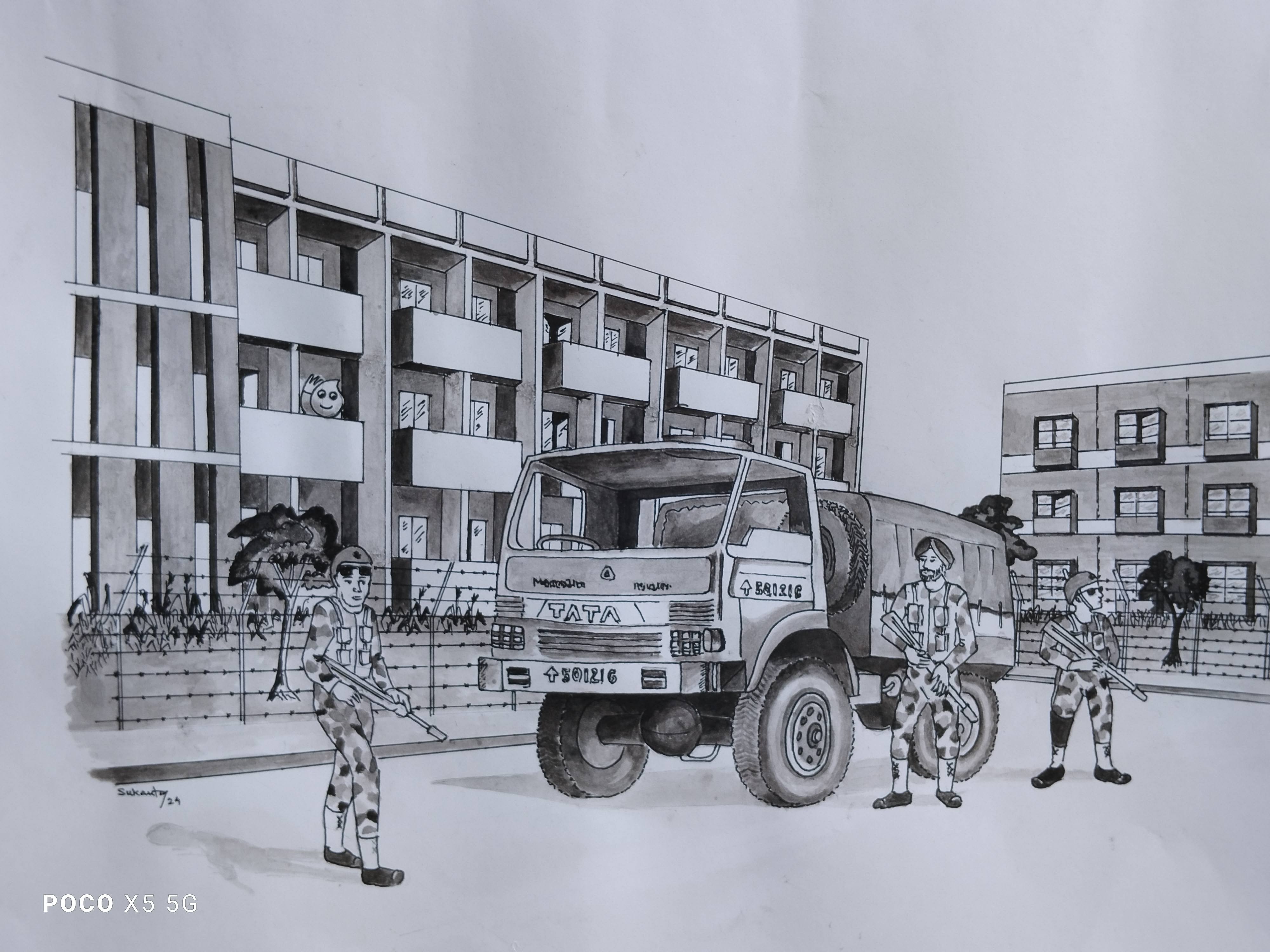 An army truck on the Main Drive near Hall 1. There were no protective walls around the buildings in those days, though barbed-wire fences had been added following some incidents in the Summer of 1980. Residents from this period might also recognize the Essoman, who inhabited the top- and middle-floor balconies of Hall 1’s A- and B- wings from 1975 through 1986. Sketch: Sukanta Kundu (1980-85)