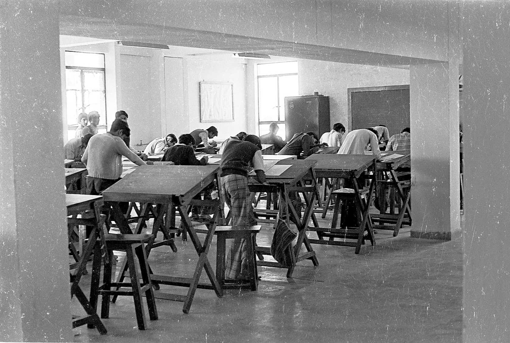 The Technical Arts. In the five-year Programme, these included TA-101 Engineering Graphics (image above), 102 Intro to Design (Carpentry), 203 Mfg Processes (Machine Shop), 204 Mfg Processes (Smelting), and 306 Computer Programming. Later, in the 4-year program, the Carpentry class was eliminated and the Mfg Processes classes combined into one. Picture: Shirish Joshi, Jan 1979