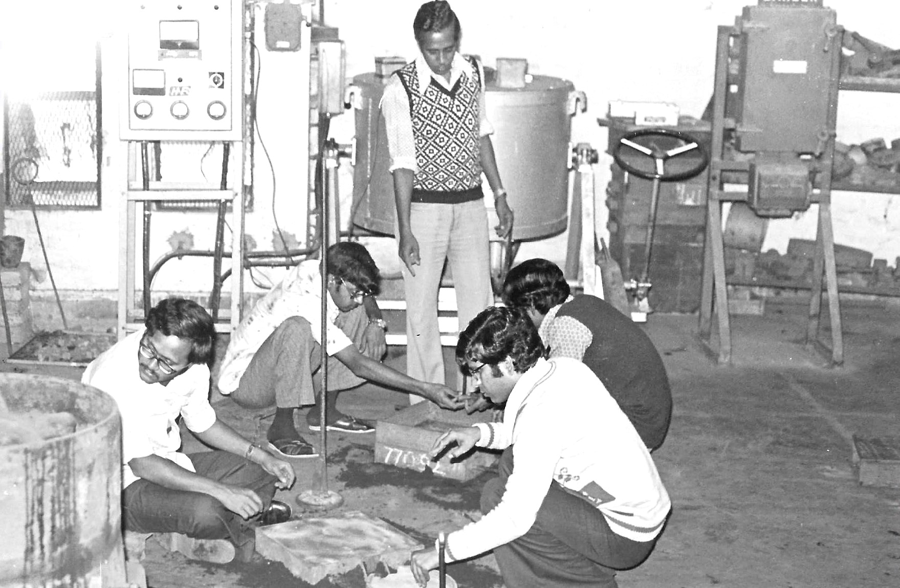 (L): TA-203, the Machine Shop. Visible here is Ramkrishna Jha, Machine Shop Technician. He was a really good machinist, and most helpful, always ready to spend long hours in the workshop to help us take those projects to completion. Picture: Shirish Joshi (R): TA-204, A smelting/casting workshop assignment in progress. Picture: The Way We Were, 1979, shared by Dinesh Jain (1974-79)