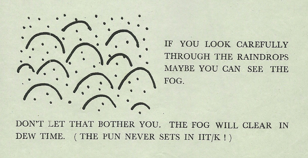 So I had just finished a plate of French toast here in New Jersey, thanks to my wife, Mary, and my mind wandered to IITK where the French toast was different---salty, and not sweet. Kaddu (Pumpkin) ketchup is the condiment, not maple syrup. Lots of little onion bits are happily embedded in the French toast batter. Our Umesh Mishra is at the table asking for more “French Toast”, but in IITK language . There are massive pitchers of tea….weak tea, but unending, and still very drinkable.