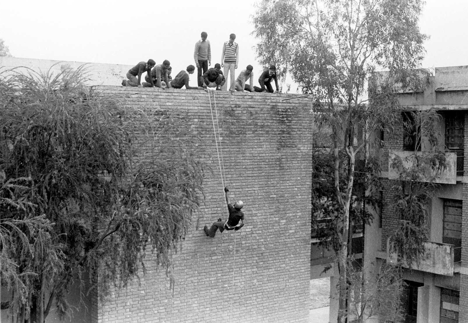 This climb up the Hall 1 stairwell was completed by members of the IITK Mountaineering Club. Climbing the wall is Shankar Baliga (1974-79). Note the proper Personal Protective Equipment worn, without which such climbs should never be attempted. Picture: Shirish Joshi