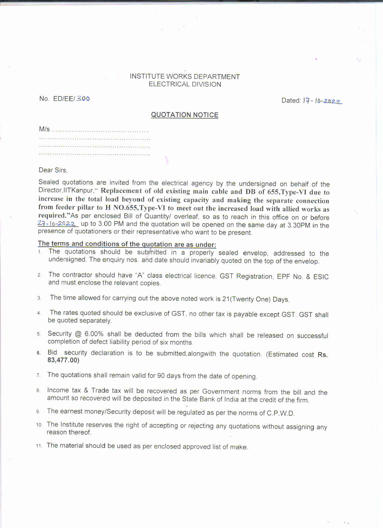 Replacement of defective power supply cable from switchroom to C-Block Ground Floor Hall -9 and other associated works. |