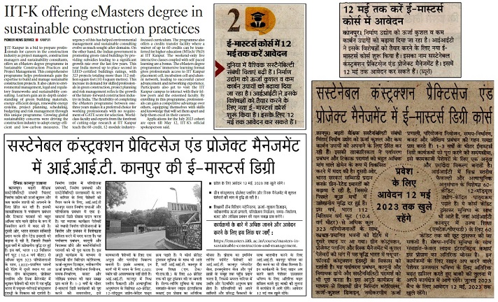 Sr No. | Date | Headline / Summary | Publication | Edition | Page No. | Journalist/Source | Print | 1 | 3 May 23 | IIT-K offering eMasters degree in Sustainable Construction Practices | Pioneer | Lucknow | 4 | Correspondent | 2 | 3 May 23 | सस्टेनेबल कंस्ट्रक्शन प्रैक्टिसेज एंड प्रोजेक्ट मैनेजमेंट में आई.आई.टी. कानपुर की ई-मास्टर्स डिग्री | Kanpur Ujala | Kanpur | 3 | Correspondent | 3 | 3 May 23 | ई - मास्टर्स कोर्स में 12 मई तक करें आवेदन | Hindustan | Kanpur | 3 | Correspondent | 4 | 3 May 23 | सस्टेनेबल कंस्ट्रक्शन प्रैक्टिसेज एंड प्रोजेक्ट मैनेजमेंट में ई-मास्टर्स डिग्री कोर्स | Aaj | Kanpur | 4 | Correspondent | 5 | 3 May 23 | 12 मई तक करें ई-मास्टर्स कोर्स में आवेदन | Amar Ujala (My City) | Kanpur | 5 | Correspondent | Online | 1 | 4 May 23 | Good News: अब घर बैठे मिलेगी IIT कानपुर से मास्टर्स की डिग्री, इस तारीख तक करें आवेदन | News18 | Online Web | NA | Akhand Pratap Singh | 2 | 2 May 23 | IIT Kanpur launches new eMasters degree programme on sustainable construction, no GATE score needed | India Today | Online Web | NA | Bureau | 3 | 2 May 23 | This comprehensive program will help professionals gain the expertise to build and manage sustainable construction projects | Business Today | Online Web | NA | Nidhi Singal | 4 | 2 May 23 | IIT Kanpur offers eMasters degree in sustainable construction practices and project management | Careers360 | Online Web | NA | Rohan D Umak | 5 | 2 May 23 | आईआईटी कानपुर की ई-मास्टर्स डिग्री से सस्टेनेबिलिटी के क्षेत्र में आएगी परिपक्वता | Hindusthan Samachar | Online Web | NA | Bureau | 6 | 2 May 23 | No GATE Score Needed For This IIT Kanpur EMasters Programme | Education Bytes | Online Web | NA | Bureau | 7 | 2 May 23 | IIT Kanpur’s eMasters degree in Sustainable Construction Practices and Project Management to advance sustainability | Mix Point | Online Web | NA | Bureau |