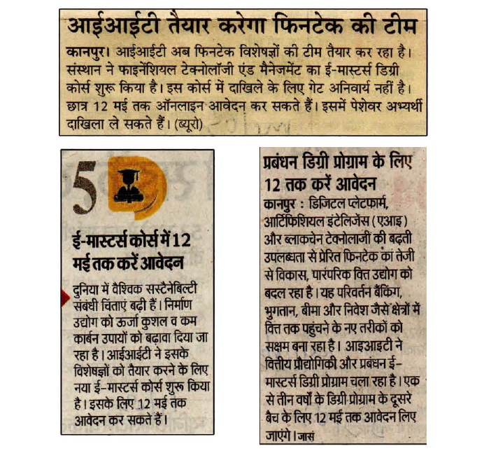 फिनटेक विशेषज्ञों को तैयार करने के लिए आईआईटी कानपुर का फाइनेंशियल टेक्नोलॉजी एण्ड मैनेजमेंट में ई-मास्टर्स डिग्री प्रोग्राम