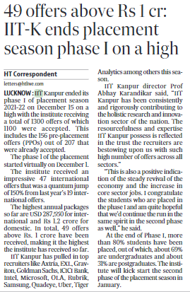 Total 1300 offers, 47 international, were made to IIT-Kanpur students till the end of phase I, out of which 1100 were accepted.