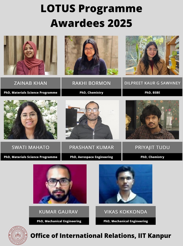The Office of International Relations, IIT Kanpur is pleased to announce that IIT Kanpur students have received the LOTUS (India-Japan Circulation of Talented Youths in Science Programme) Programme Award, supported by the Japan Science and Technology (JST). We sincerely thank JST for its continued support in strengthening collaborative research between IIT Kanpur and leading institutions in Japan. This recognition reflects the commitment to advancing interdisciplinary research through international academic collaboration.