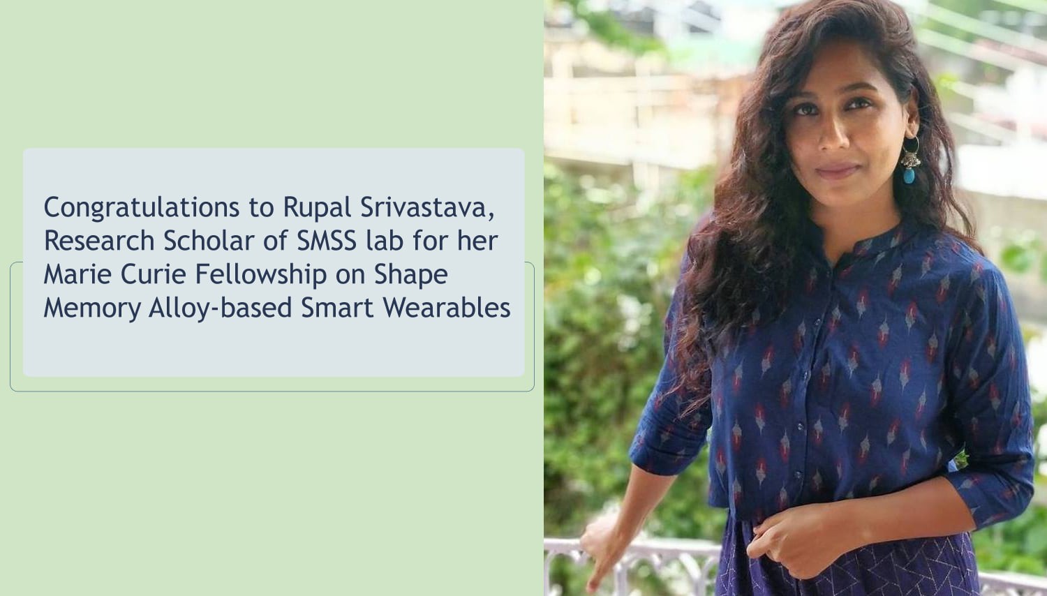 Rupal Srivastava has received the Marie Curie Fellowship - 2021-2023 Cofund to conduct Postdoctoral research at Science Foundation Ireland- Smart Manufacturing Research Center (CONFIRM). The project she proposed is on Shape Memory Alloy-based Smart Wearables.